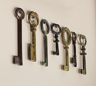 We have been (I say we, & it's me and my lovely fiance), decorating our home on the weekends as much as possible. We moved into our place in December of 2008! We absolutely love it. Just a rental for right now, until we decide on what to do. Anywho, I just have been searching the net for some awesome decor ideas and blogs designers ;) little sneeky, eh? I saw these Vintage Keys @ Pottery Barn and I love them!